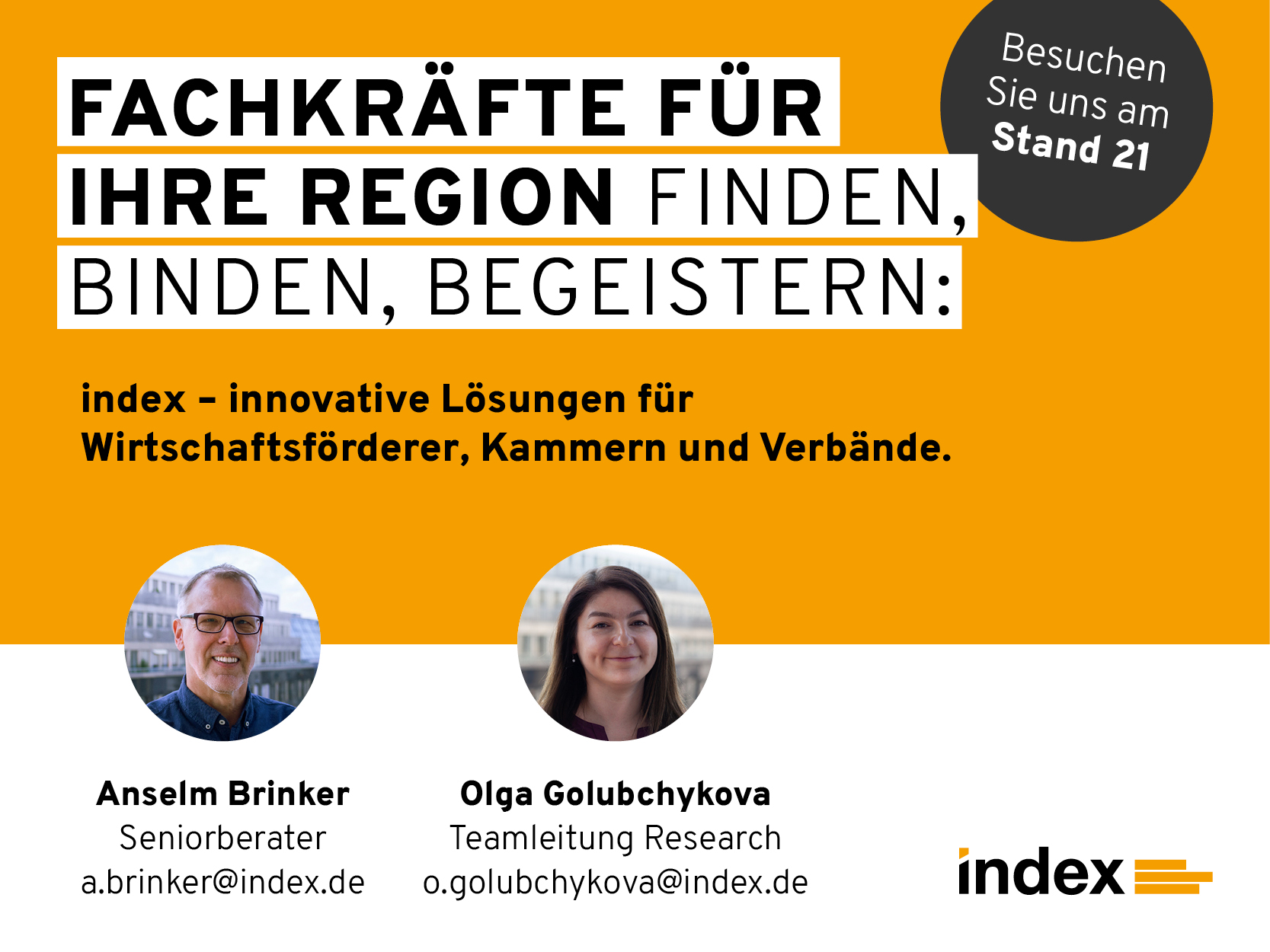 Ob Ausbildungsportale wie „Meine Ausbildung in…“, regionale Stellenmärkte in zahlreichen Städten und Regionen, Unternehmensbefragungen, Workshops, Veranstaltungen oder Standortanalysen, Regionalstudien und KI-Dashboards – index überzeugt mit einem breiten und bedarfsorientierten Leistungsspektrum.